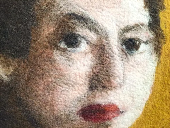 Ces tableaux en feutre, réalisés à partir de couches successives de laine colorée et malaxée avec de l’eau, déploient une œuvre où la matière elle -même semble douce et veloutée. Le portrait d’une femme ou le paysage se dessine lentement, sans contours nets, la laine fondant presque avec le fond et dissipant tout rigueur. Les personnages ou les paysages se forment comme s’ils étaient pris dans un rêve, enveloppés d’une atmosphère douce et chaleureuse, comme une couverture protectrice. Des broderies sur feutre donnent forme à des femmes en suspension, figures fragiles entre chute et équilibre.
