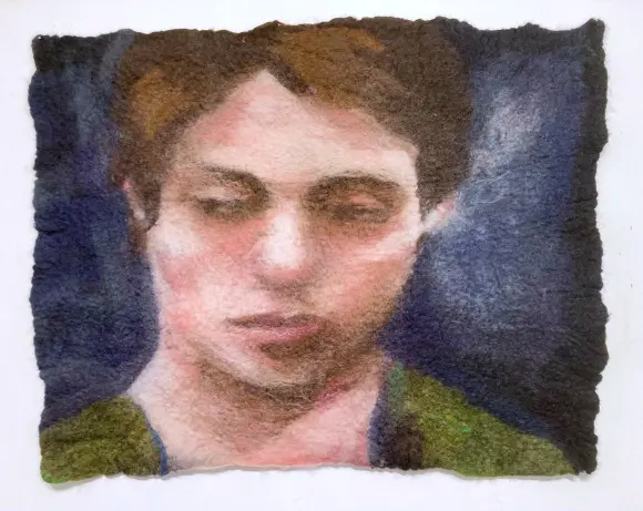 Ces tableaux en feutre, réalisés à partir de couches successives de laine colorée et malaxée avec de l’eau, déploient une œuvre où la matière elle -même semble douce et veloutée. Le portrait d’une femme ou le paysage se dessine lentement, sans contours nets, la laine fondant presque avec le fond et dissipant tout rigueur. L’absorption de la lumière par la texture du feutre crée des effets de profondeurs, et chaque fibre, à la fois solide et souple, participe à ce mystère silencieux. Les personnages ou les paysages se forment comme s’ils étaient pris dans un rêve, enveloppés d’une atmosphère douce et chaleureuse, comme une couverture protectrice. Que ce soit un visage ou un sous-bois, l’œuvre invite à la contemplation d’une nature vivante, fait de laine et de lumière, où la matière semble aussi fluide qu’une idée, solide et en même temps ouverte à l’imaginaire.